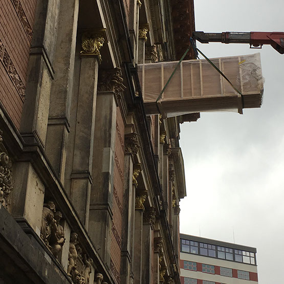 Leistungsumfang Beratung/Planung, Entgegennahme Anlieferung inkl. Entladen von 3 Tautlinern im Staplerbetrieb, Support beim Einkranen in das 1. OG. Vollständige Ausstellungeinrichtung, in diesem Zuge Montage der Fensterlamellen in den Räumen, Installation/Reparatur von zwei Holzbildern, Aufbau/Einrichten des Buchenraums, Hängen von 70 bedruckten Pergamin-Fahnen, Aufbau Sockel und Stellen von 50 Architekturmodellen, Montage Großfoto in 6x6m Holzrahmen, Ausstellungsausleuchtung, Installation Medientechnik. Kompletter Ausstellungsabbau inkl. aller Verpackungs-, Logistik-/Speditions- und Entsorgungsarbeiten.