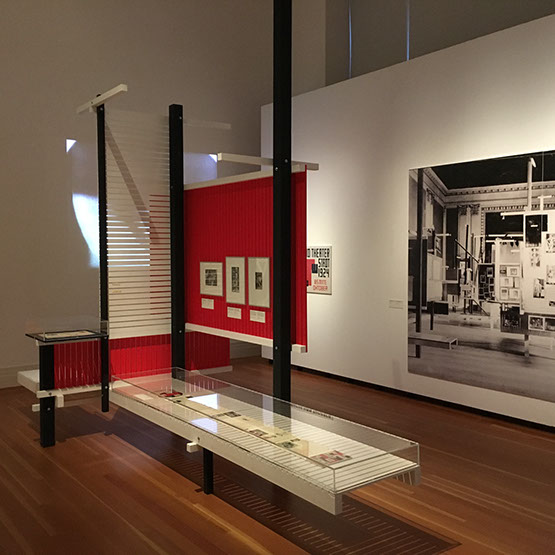 Leistungsumfang Bereitstellung 30 Vitrinen, Errichten von Podestflächen, Ausstellungsaufbau, inkl. Hängen der Bilder, 40 Blow-Ups auf Re-board®-Platte, Aufbau 1:5-Modell der „Surrealist Gallery“ und der Rekonstruktionsmodelle von Kieslers Leger- und Träger-Systeme, zahlreiche Architekturmodelle, Sonderhängungen, wie die „Galaxy Paintings“, Aufbau der „Mobile Home Library“ und Stellen verschiedener Möbel in den Räumen. Abbau inkl. Verpacken der Arbeiten.