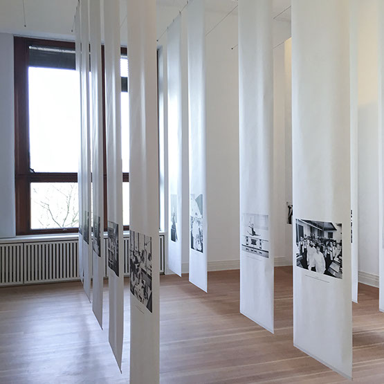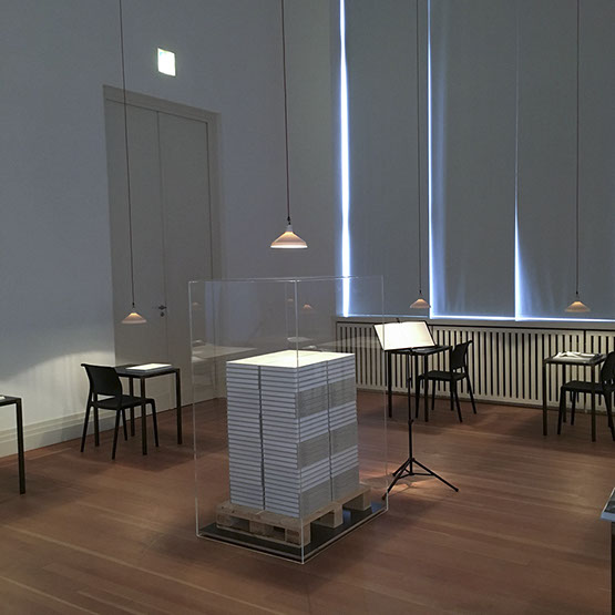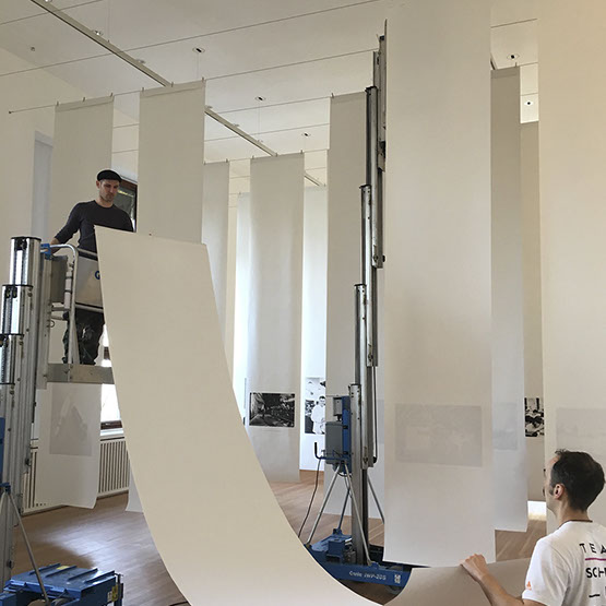 Leistungsumfang Planung/Montage Hängestruktur aus 80 Stahlseilen für die Präsentation der großformatigen Text-/ Fotobanner, Anstricharbeiten, Einrichtung Lesesaal, Aufbau Buchskulptur, Bannerhängung, Ausstellungslicht, A/V Medien, Vorbereitung Abendevent, inkl. Bestuhlung, Rednerpulte, Katalogausgaben. Abbau, Dokumentieren, Verpacken, Versand der Ausstellung.