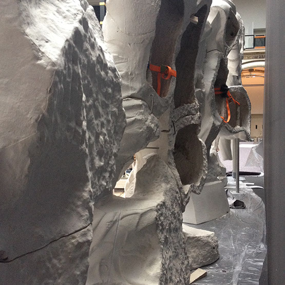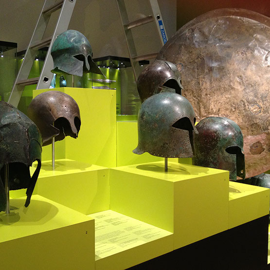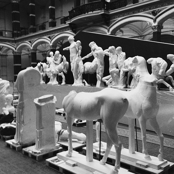 Leistungsumfang Montage von 110 Vitrinen, Entwicklung von Halter- und Sicherungssystemen, Mountmaking, Sondermontagen Zeus-Tempel, Einkranung von 35 Gipsfiguren- und Fragmenten inkl. Sicherung, Exponateinrichtung, Grafik, Ausstellungsbeleuchtung, Transport und Einlagerung Vitrinen und Sockel, Entsorgung Ausstellungsbauten