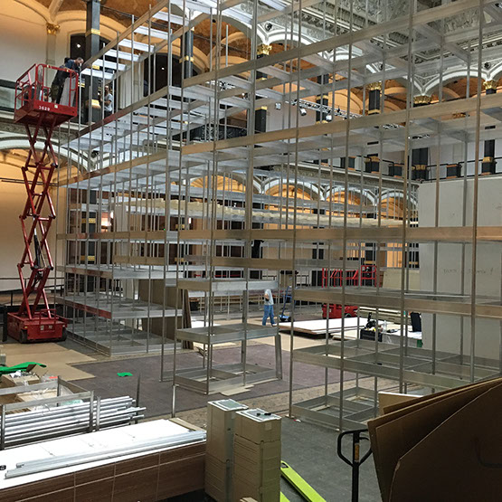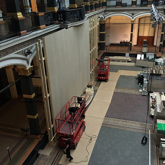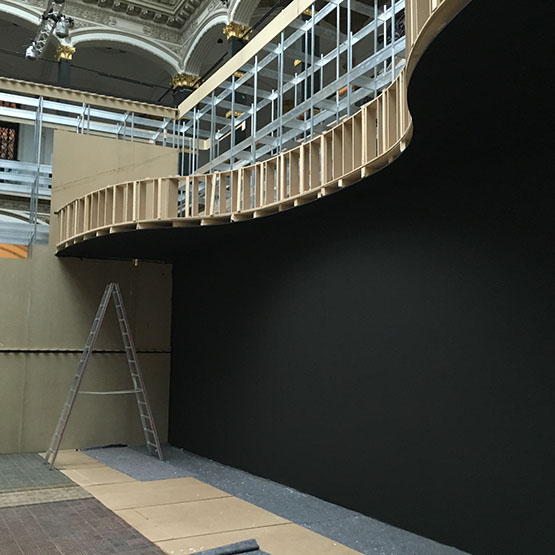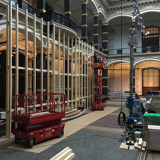 Leistungsumfang Aufbau eines Nachbaus der Lichtburg im Verhältnis 1:1 im Lichthof des MGB, Errichten der Unterkonstruktion mittels Octanorm®-System, Beplankung, vollständige Adaption an die MGB-Gebäudearchitektur. Alle Tischler-, Dekorations-, Maler-, und Bodenverlegearbeiten. Aufbau/Umbau von MGB Modulwandsystemen und bauliches Verschließen von Durchgängen in den Räumen, Verdunklungen der Fenster inkl. Dachverdunklung oberhalb des Lichthofs, Neubau einer 13 m lange Projektionswand und weiterer Ausstellungswände. Einrichtung/Ausstattung der Lichtburg. Ausstellungseinrichtung inkl. Hängen aller Fotos, Plakate, Inframes und der gesamten Grafik mit OBS, Banner und Plotts. Bereitstellung/Einrichtung Vitrinen, Installation umfangreicher AV Medientechnik und Ausleuchtung der Ausstellung. Kompletter Ausstellungsabbau inkl. aller Verpackungs-, Logistik-/Speditions- und Entsorgungsarbeiten.