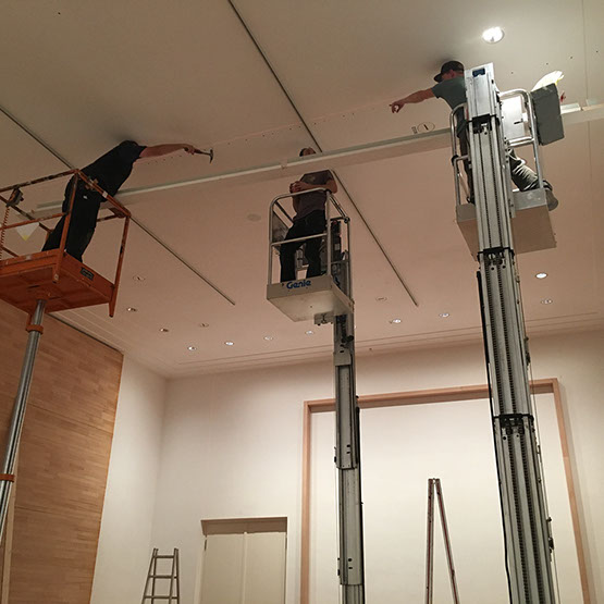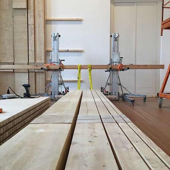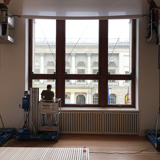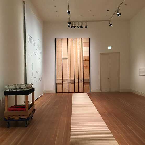 Leistungsumfang Beratung/Planung, Entgegennahme Anlieferung inkl. Entladen von 3 Tautlinern im Staplerbetrieb, Support beim Einkranen in das 1. OG. Vollständige Ausstellungeinrichtung, in diesem Zuge Montage der Fensterlamellen in den Räumen, Installation/Reparatur von zwei Holzbildern, Aufbau/Einrichten des Buchenraums, Hängen von 70 bedruckten Pergamin-Fahnen, Aufbau Sockel und Stellen von 50 Architekturmodellen, Montage Großfoto in 6x6m Holzrahmen, Ausstellungsausleuchtung, Installation Medientechnik. Kompletter Ausstellungsabbau inkl. aller Verpackungs-, Logistik-/Speditions- und Entsorgungsarbeiten.