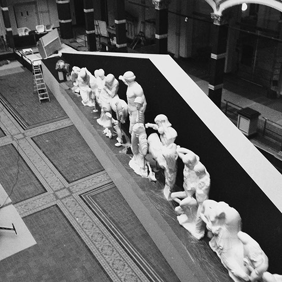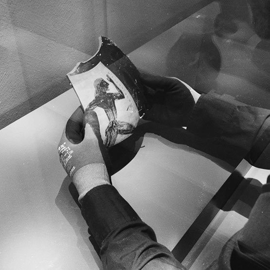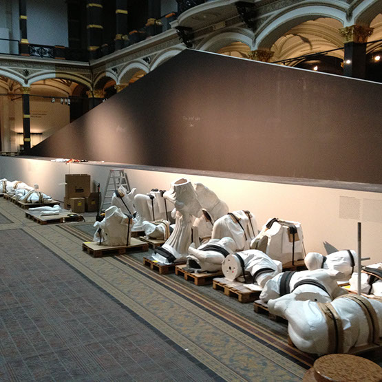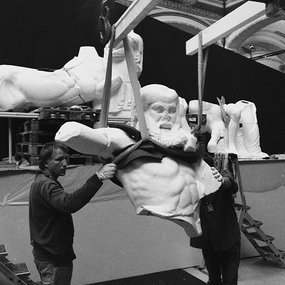 Leistungsumfang Montage von 110 Vitrinen, Entwicklung von Halter- und Sicherungssystemen, Mountmaking, Sondermontagen Zeus-Tempel, Einkranung von 35 Gipsfiguren- und Fragmenten inkl. Sicherung, Exponateinrichtung, Grafik, Ausstellungsbeleuchtung, Transport und Einlagerung Vitrinen und Sockel, Entsorgung Ausstellungsbauten