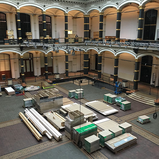 Leistungsumfang Aufbau eines Nachbaus der Lichtburg im Verhältnis 1:1 im Lichthof des MGB, Errichten der Unterkonstruktion mittels Octanorm®-System, Beplankung, vollständige Adaption an die MGB-Gebäudearchitektur. Alle Tischler-, Dekorations-, Maler-, und Bodenverlegearbeiten. Aufbau/Umbau von MGB Modulwandsystemen und bauliches Verschließen von Durchgängen in den Räumen, Verdunklungen der Fenster inkl. Dachverdunklung oberhalb des Lichthofs, Neubau einer 13 m lange Projektionswand und weiterer Ausstellungswände. Einrichtung/Ausstattung der Lichtburg. Ausstellungseinrichtung inkl. Hängen aller Fotos, Plakate, Inframes und der gesamten Grafik mit OBS, Banner und Plotts. Bereitstellung/Einrichtung Vitrinen, Installation umfangreicher AV Medientechnik und Ausleuchtung der Ausstellung. Kompletter Ausstellungsabbau inkl. aller Verpackungs-, Logistik-/Speditions- und Entsorgungsarbeiten.